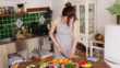 Wide shot van een jonge vrouw koken met behulp van digitale Tablet voor recept - 4K Stockvideo
