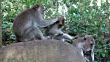 A family of wild Macaque monkeys sit in the rainforest, on the edge of Ubud, Bali, Indonesia. The parents groom and nurture the young animals.