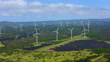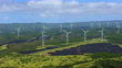 Aerial shot of wind farm and solar farms on the island of Oahu in Hawaii. Shot in USA.