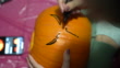 High angle view of a woman drawing a face on a Halloween pumpkin while watching a tutorial