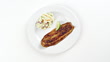 CU Woman hand entering setting down round white plate with blackened halibut fish and cole slaw / Omaha, Nebraska, United States - HD Stockvideo