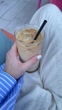 Woman enjoys refreshing iced coffee with straw, perfect for a hot summer day