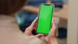 Young Woman Holding Mobile Phone in Hands and Using Green Touch Screen by Fingers. One Adult Girl Tapping on Vertical Chroma Key of Colorful Smartphone Touchscreen to Click and Scrolling or Swiping Up. Distance Occupation of Person in House or Apartment Buying Book in Online Store Shop or Looking at Blog Content