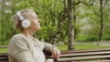 Handheld footage of a woman is sitting on a park bench in a public park. She is enjoying the sun and listening to music.
