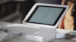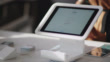 CU. A woman taps her credit card on a credit card reader to pay for her order at a cafe.