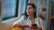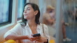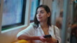 4k footage of Woman using mobile phone and looking outside through window while commuting in the subway