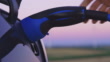 Slow motion shot of a woman's hand plugging an EV plug into her car at charging station at dusk. Shoot in 8K resolution.
