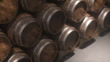 Aged wooden barrels of wine, brandy or whiskey in a large warehouse. Moving along a long row of wine barrels at a vintage winery with alcohol