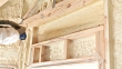 A construction worker is spraying expandable foam insulation between window header wall studs in a new home construction project. Expandable foam is a newer method of insulation, compared to fiberglass bat, it is more efficient and costly than conventional insulation methods.