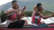 A group of friends having a kayak race on Derwent Water in the Lakes District in Cumbria.