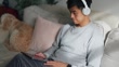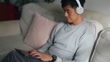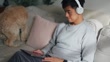 A young Asian man sitting on a light-colored sofa, wearing white headphones and looking at a tablet in his hand. He appears relaxed and focused, watching a video or listening to music or a podcast. He is dressed casually in a grey sweatshirt and dark pants. Beside him on the sofa is a fluffy dog, also resting comfortably. Soft natural light and pastel cushions contribute to the cozy, peaceful atmosphere of the scene. The overall vibe is calm, tech-savvy downtime in a home environment. The scene captures a productive moment, suggesting remote work, digital creativity, casual learning in a home office environment.