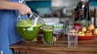 A young boy making a Juice with a slow juicer, at home on the kitchen table. - 4K Stockvideo