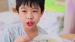 Young boy sitting on a hospital bed, savouring a bowl of comforting rice porridge for breakfast. Boy is currently undergoing treatment for an illness in a hospital ward, where healthcare and medicine combine to aid his recovery.