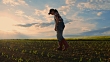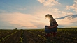 Young teenage girl farmer with digital tablet checking saplings in sunny,rural field. MS,tilt up,slow motion.