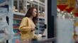 Young Woman at Supermarket Buying Food and Scanning Codes at Self Checkout and Putting Groceries in Shopping Bag - 4K Stockvideo