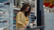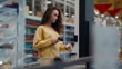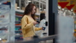 Young Woman at Supermarket Buying Healthy Food and Scanning Codes at Self Checkout with Digital Display and Putting Groceries in Paper Bag. Beautiful Person Shopping at Convenience Store and Paying for Goods at Cash Register with Smart Screen. Commercial Technology for Retail Customers of Mall