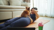 Young woman practicing yoga exercising at home living room - 4K Stockvideo